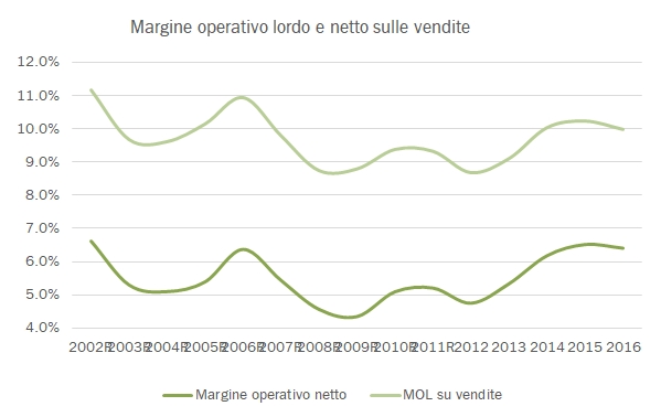- I margini di profitto dell’industria in generale si sono leggermente contratti nel 2016, essenzialmente dovuto all’aumento dei costi esterni che hanno determinato una riduzione del valore aggiunto dal 19.4% al 19.1%. Il calo è essenzialmente legato alle cooperative che hanno ridotto dal 15.1% al 14.3% e, come “taglio trasversale” alle aziende specializzate negli spumanti, che causa forte incremento dei costi delle materie prime hanno subito un calo del valore aggiunto sulle vendite (che peraltro crescono a doppia cifra) dal 16.9% al 15.8%.