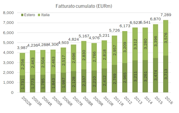Comunque, tutte queste cose bollono in pentola. Per partire, diciamo che queste 155 aziende che rappresentano il 66% delle esportazioni circa il 70% delle vendite totali del settore e degli addetti. Hanno fatturato nel 2016 7.2 miliardi di euro, +5%, generando 464 milioni di utile operativo, con un margine stabile, e un utile netto di 336 milioni, in crescita del 24% sul 2015. Per il 2017, i dati preliminari di Mediobanca (che l’anno scorso avevano leggermente sovrastimato la performance effettiva) dicono +6.5%, quindi accelerazione, con l’Italia in crescita del 5% e le esportazioni dell’8%. Passiamo a commentare qualche altro dato di dettaglio.