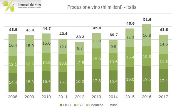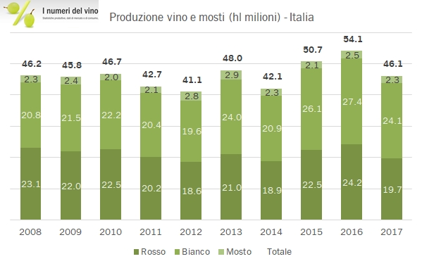 - La produzione 2017 in Italia ha raggiunto quota 46.1 milioni di ettolitri includendo vini e mosti, in calo del 15% sul 2016. Nello specifico, si sono prodotti 43.8 milioni di hl di vino, -15% e 2.3 milioni di mosti, -10%. Visti così i dati sono dunque perfettamente allineati medie storiche del decennio 2007-2016.