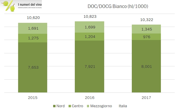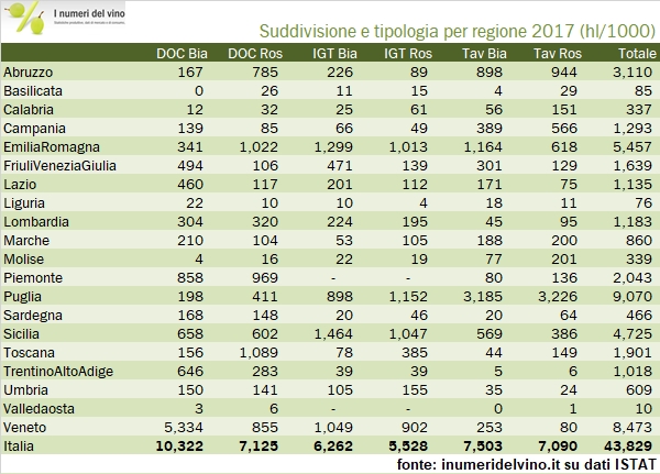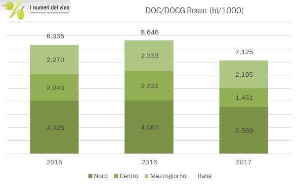 Il dato ufficiale di ISTAT dice 46.1, quindi il 15% circa in più. Secondo ISTAT è stata dunque una vendemmia in calo significativo rispetto al 2016 (-15%) ma non disallineata dalle evidenze storiche. Bene i vini bianchi (-12% ma sopra media del 9%), male i vini rossi (-18% e 8% sotto media), bene i vini DOC e i vini comuni (in calo a doppia cifra ma comunque del 7% sopra la media decennale) a discapito dei vini IGT (-23% e 14% sotto la media). Infine, da un punto di vista geografico, il calo produttivo ha interessato soprattutto il Nord e il Centro (il 7% e il 24% sotto la media decennale), mentre la produzione al sud è calata molto meno di quanto stimato e si è addirittura posizionata sopra i nostri dati 2007-2016 medi del 17%.
