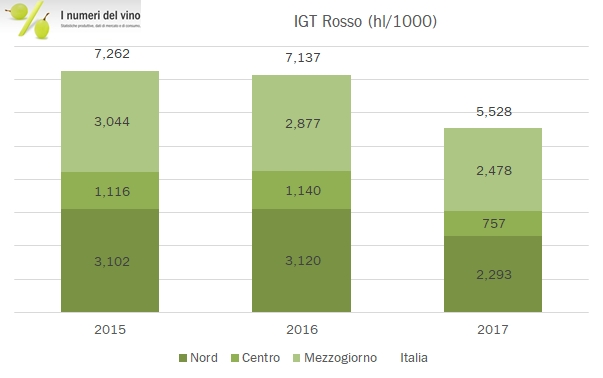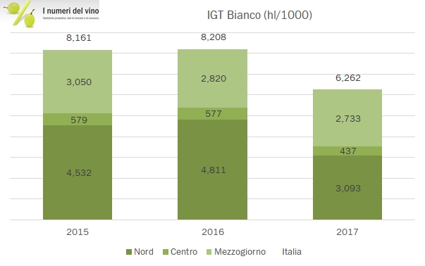 - La produzione di vini DOC di 17.4 milioni di hl (10.3 bianchi e 7.1 rossi) scende dell’11% ma è comunque sopra la media. Gli IGT invece passano da 15.3 a 11.8 milioni di hl, con un andamento coerente tra bianchi e rossi (6.2 e 5.5 milioni di hl).