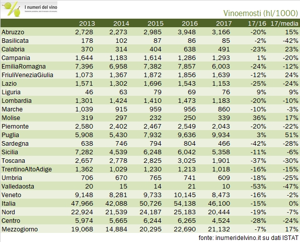 ISTAT ha pubblicato i dati finali relativi alla produzione italiana di vino 2017. Sono numeri piuttosto diversi dalla previsione che avevo messo in linea a settembre 2017, che stimava una produzione mosti inclusi di 40 milioni di ettolitri. [nota del 26/05/2018: sebbene questi siano i dati ufficiali e definitivi, è opinione diffusa negli operatori del settore che la produzione 2017 sia stata inferiore, con particolare riferimenti ad alcune regioni quali la Puglia]