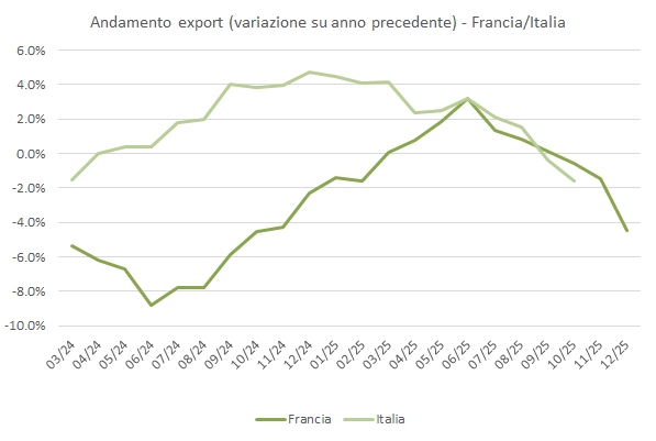 Diciamo che il dato non è un buon segno per l’Italia, che è “indietro” di due mesi rispetto alla Francia e che, a ottobre 2025, era a -0.6% quando la Francia era a -1.6%. Come dire… la Francia ha perso 3 punti percentuali in due mesi, vedremo cosa succede alle nostre esportazioni.