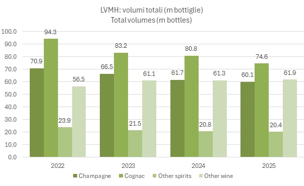 LVMH ha presentato i risultati annuali il 27 gennaio. La seconda parte del 2025 è andata un po’ meglio della prima, con un +1% a livello organico per il gruppo contro il -3% del primo semestre. La divisione Wine and Spirits, però, resta ancora molto debole, con un calo organico del 4% nel secondo semestre dopo il -7% del primo e, direi, ancora più grave, un terribile -9% nel quarto trimestre.