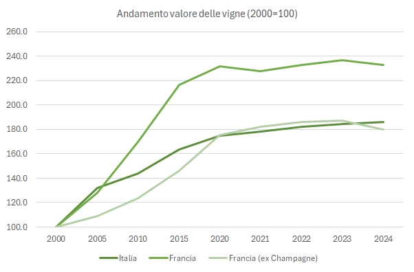 La seconda considerazione da fare (grafico sopra) riguarda il confronto tra i valori dei vigneti italiani e quelli dei vigneti francesi. Posto che il valore dei vigneti francesi è quasi certamente superiore a quello di quelli italiani (non abbiamo un dato totalmente omogeneo), i prezzi dei vigneti in Francia stanno scendendo (probabilmente -4% nel 2024 mettendo tutto insieme) mentre quelli italiani… non ancora (+1.1% nel 2024). Questo forse giustifica il fatto che in Francia si stiano estirpando vigneti e in Italia non ancora…