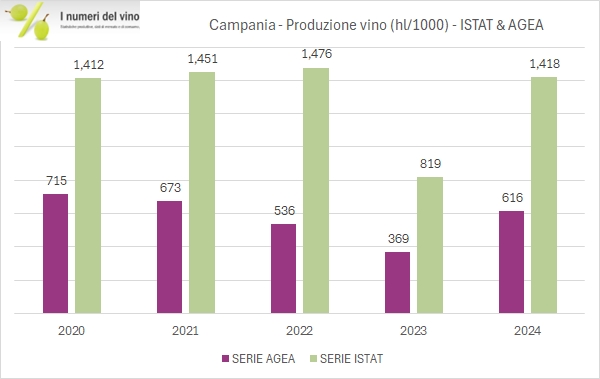 Ad ogni modo, la produzione di vino in Campania nel 2024 è stata in forte ripresa rispetto al pessimo 2023, con un recupero nell’ordine del 70% (più o meno coerente tra le due fonti) e un livello produttivo del 6-8% superiore alla media storica (di nuovo coerente). L’unico problema è che, secondo ISTAT, si sono prodotti 1,4 milioni di ettolitri (di cui 963mila di vini comuni), mentre, secondo AGEA, la produzione è molto più bassa, a 616mila ettolitri (di cui solo 127mila di vini comuni).