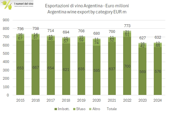 L’Argentina sta procedendo attivamente a ridimensionare la propria capacità produttiva vinicola. Al di là dei dati produttivi che analizziamo oggi (circa 10.8 milioni di ettolitri, stabili sul 2024 e dell’8% sotto la media decennale), questo è chiaramente l’aspetto da mettere in evidenza. La superficie vitata, che ha raggiunto il suo picco a circa 225mila ettari nel 2015 è scesa nel 2024 a meno di 200mila ettari, ossia -12%. Per il solo vino (grafico qui sopra), si è passati da 207mila a 184mila ettari nel giro di 9 anni, con un andamento in accelerazione.