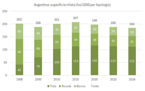 Si tratta di un puro fenomeno di mercato: eliminazione di vigneti non più produttivi, di vigneti con varietà meno richieste dal mercato (Cereza, Criolla Grande, Pedro Giménez, a favore del Malbec), ma anche concentrazione della capacità produttiva, con un leggero incremento della superficie per azienda vinicola. Noterete anche come il calo più marcato è venuto dalle varietà rosate e bianche (oltre il 20% in meno), mentre le rosse anche negli ultimi 10 anni il calo è stato meno marcato (-8%)