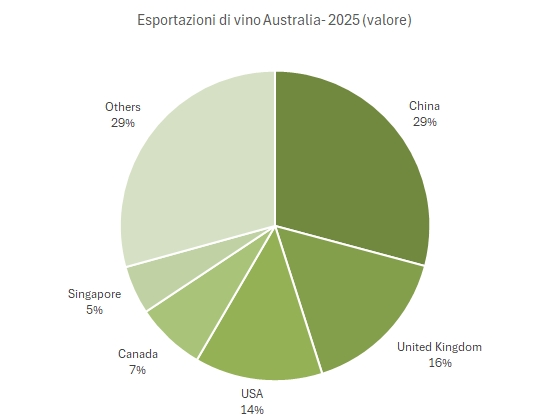 Le esportazioni di vino australiano nel 2025 segnano un ritorno alla normalità dopo il rimbalzo “elastico” del 2024 legato alla riapertura del mercato cinese. I dati UN Comtrade da noi rielaborati per riportarli alla realtà locale dei dollari australiani mostrano un calo del 9% in valore a 2432 milioni di dollari australiani e del 5% in volume a 6.3 milioni di ettolitri. Tradotto in euro nelle nostre tabelle annuali che mostreremo tra qualche settimana, le esportazioni australiane sono calate del 15% a 1.36 miliardi di euro.