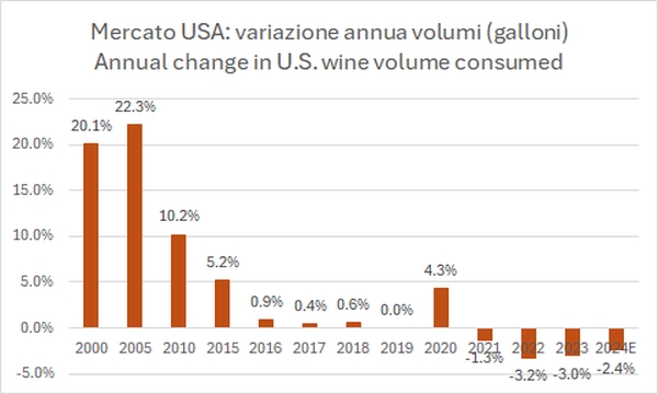 In base ai dati di mercato di Shanken (e le stime di SVB per il 2024), il consumo di vini nel mercato statunitense ha visto tassi di crescita a doppia cifra nella sua fase di espansione nei primi anni di questo secolo, con crescite annue anche superiori al 20%, per poi scendere al 10% nel 2010, al 5% nel 2015, avere tassi di crescita sostanzialmente vicini allo zero nel 2016-2019, rimbalzare nell’anomalo 2020 (le persone, spaventate e chiuse in casa per la mala gestione della crisi Covid, hanno trovato anche il vino come valvola di sfogo!) e segnare dei cali netti dal 2021 ad oggi, il dato 2024 è una stima di SVB, Silicon Valley Bank.