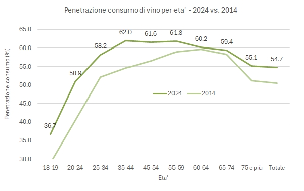 Il contesto lo conosciamo: i consumi di vino calano. Pochi minuti fa scrivevo delle vendite nella GDO: se la “quota di mercato” della GDO è rimasta stabile nel 2024, i consumi in ettolitri sono scesi dell’1.1% (-2.1% nel 2025, quindi anche peggio). Il dato ISTAT ci dice che in Italia il 54.7% della popolazione ha consumato vino, contro il 55.1% dello scorso anno. Ben sappiamo che il modello di consumo si orienta verso una frequenza non giornaliera (33% della popolazione, contro il 15% del consumo abitudinario).