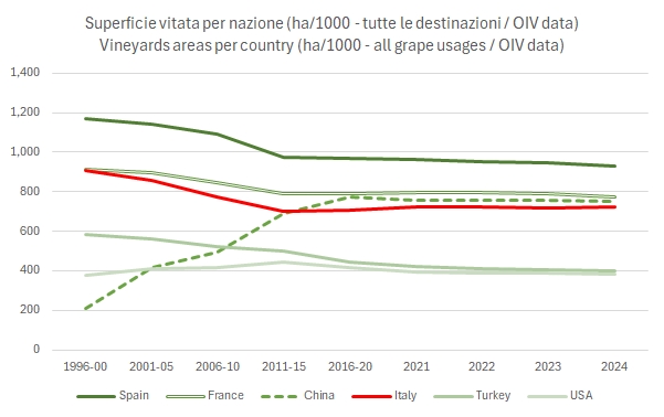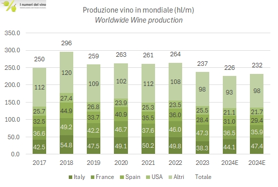 OIV ha rilasciato la prima stima di produzione mondiale di vino per il 2025, con una previsione di 228-235 milioni di ettolitri, che nel punto mediano la piazzano circa il 3% sopra il 2024, che però era stato il minimo storico. Ora, forse c’è da essere rincuorati nel leggere questi dati perché è meglio produrre meno, visto l’andamento calante dei consumi. Infatti, con consumi ora stimati intorno a 215 milioni di ettolitri e 25-30m/hl impiegati per altri usi, una produzione di 230 milioni di ettolitri è forse leggermente corta, ma un toccasana per ridurre le scorte e tenere i prezzi.