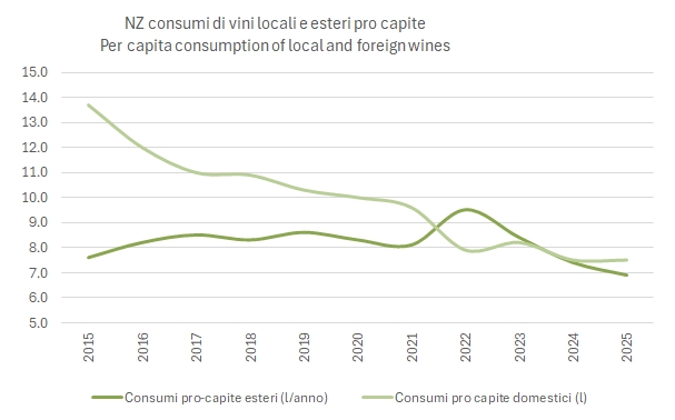 Il settore vinicolo neozelandese è in fase di stabilizzazione. Lo dicono diversi dati del rapporto annuale della New Zealand Winegrowers Inc, a partire dalla revisione al ribasso delle superfici vitate 2024 (attese di nuovo in crescita nel 2025, vedremo se lo confermano il prossimo anno), dalla riduzione delle aziende vinicole (già capitato nel 2023), dalla riduzione del prezzo di vendita delle uve (un anno indietro, 2024) e dalla stabilizzazione delle esportazioni di vino, che sono sempre più legato al Sauvignon Blanc (2.5m/hl dei 2.8m/hl esportati nei 12 mesi a giugno 2025).