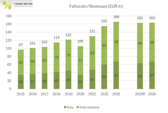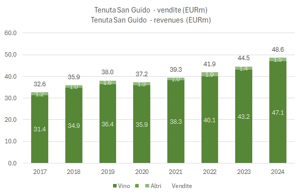 Dopo aver curiosato nei bilanci di Armand Rousseau (prontamente secretati da quel giorno), ho pensato che fosse il caso di guardare a una delle più grandi eccellenze vinicole italiane, il Sassicaia, che, con altre due etichette, è la spina dorsale di Tenuta San Guido. Decisamente più grande della francese (42 milioni di fatturato, di cui 40 nel vino, contro 14 nel 2022), Tenuta San Guido ha un invidiabile e ben prevedibile percorso di crescita, che continua ininterrottamente da anni, con l’eccezione del 2020, stabile.