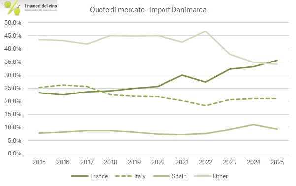 Le importazioni di vino in Danimarca riprendono a crescere nel 2025, raggiungendo 749 milioni di euro, +3% rispetto al 2024. Nonostante il rimbalzo, le importazioni restano ben sotto il picco del 2021-22 (830 milioni). Nel 2025 è ancora il vino francese a guadagnare quote di mercato e a rafforzare la sua posizione di leadership, con una quota del 36% del mercato. L’Italia mantiene il primo posto in termini di volume, che, per il mercato, resta stabile a poco meno di 2 milioni di ettolitri. Da notare che nel 2025 l’Italia ha registrato un forte calo nel segmento degli spumanti, dopo le buone performance del 2024, mentre la Francia ha ulteriormente rafforzato il suo dominio.