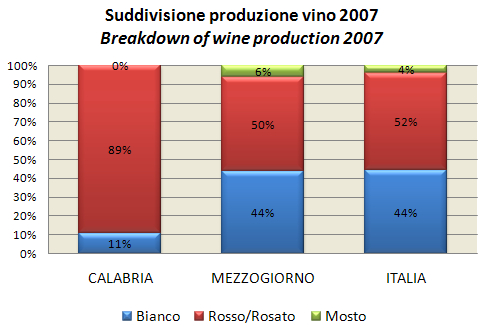 • Passando a vedere come si compone la produzione, possiamo subito notare che la Calabria e’ una regione dove l’incidenza della DOC/DOCG e’ ancora piuttosto bassa rispetto alla media nazionale, e un pochino meglio del Mezzogiorno. Notiamo anche che la Calabria ha un utilizzo delle IGT molto limitato, pari soltanto al 7% della produzione, contro la media italiana del 29%.