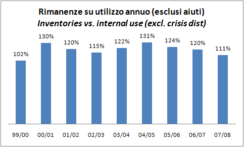 Il primo grafico e’ anche il piu’ significativo: la linea punteggiata mostra il totale di consumo umano e degli usi industriali. Nella vendemmia 2007, si stimano 165m di ettolitri tra consumo (140m) e utilizzi industriali (25m), oltre a 5m di saldo positivo sull’import-export. Questo si confronta con una produzione totale di vino di circa 161m di ettolitri. The first chart, is the most significant: the dotted line shows the total human consumption and industrial uses. In 2007, the report estimates 165m hl in consumption (140m) and industrial uses (25m) and 5m of surplus for import-export. That compares with a total wine production of about 161m hl.