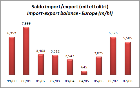 Quello che cambia invece e’ il rapporto tra rimanenze e utilizzazioni del vino, che migliora dal 130% al 111%. Questo 11% in eccesso e’ sostanzialmente assorbito da (1) le esportazioni in eccesso rispetto all’import, pari a circa 5m di ettolitri; (2) le distillazioni finanziate con i soldi pubblici. Infine, facciamo il punto sul saldo import export come riportato dall’Unione: le importazioni totali sono a 57m/hl, mentre le esportazioni hanno raggiunto quasi i 63m/hl: il risultato e’ quello che vedete nell’ultimo grafico, cioe’ un graduale miglioramento del saldo import/export. What is different, however, is the relationship between inventories and uses of wine, which improved from 130% to 111%. This 11% excess was substantially absorbed by (1) the excess of exports over imports, amounting to about 5m hl (2) distillation financed with public money. Finally, we review the import export balance: the total imports are 57m/hl, while exports reached almost 63m/hl: the result is what you see in the chart, that shows a gradual improvement in the balance of import/export.