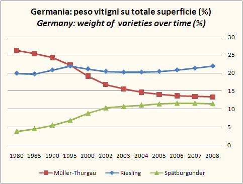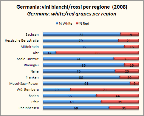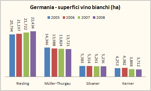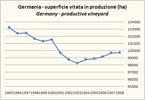 Siamo al secondo appuntamento con la Germania, per aggiornare al 2008 i dati relativi alla produzione e alle superfici vitate, sempre con i dati del German wine institute. La Germania una produzione di vino stabile, una crescente focalizzazione sul suo vitigno piu’ importante (il Riesling, a spese degli altri vitigni a bacca bianca) e, dopo una graduale riqualificazione della vigna verso i vini rossi (che sono passati dal 15% al 37% delle superfici vitate), una stabilita’ nella suddivisione dei vitigni. La specializzazione paga, e i tedeschi sembra la stiano mettendo in pratica…