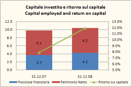 La conseguenza di tutto questo e’ un ritorno sul capitale destinato gia’ buono (oltre il 10%), ma destinato probabilmente a esplodere nel 2009, per l’azione combinata di un utile operativo in significativo incremento e un capitale investito molto esiguo.