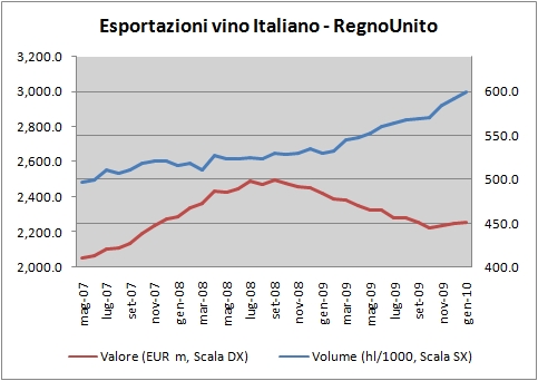 Le esportazioni di vino hanno registrato un segno positivo anche in gennaio, corredato questa volta da una chiara inversione di tendenza del segmento degli spumanti e da una accelerazione delle esportazioni di vino imbottigliato. I grafici qui di seguito attaccati mostrano meglio di ogni parola quello che sta capitando, e cioe’: (1) la graduale ripresa del valore dell’export, che sembra avere toccato il punto di minimo a novembre 2009, in ragione d’anno; (2) la graduale stabilizzazione del prezzo mix delle esportazioni che e’ tornato sotto EUR1.8 al litro, su un valore molto vicino a quello medio delle importazioni di vino nel nostro paese.