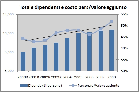 Dove ci sono problemi e’ dal punto di vista dei margini, sia per quanto riguarda i consumi che per quanto riguarda il costo del personale. Nel primo caso, la forte crescita del costo delle materie prime ha inciso sul valore aggiunto. I consumi sono saliti dal 79.8% all’80.6% del fatturato un livello toccato soltanto nel 2003; come vedremo piu’ in dettaglio nei prossimi giorni, l’incremento e’ stato completamente a carico delle aziende non cooperative, dato che le cooperative non sono influenzate dal costo delle uve e del vino, dato che pagano ai soci conferitori tutto quello che possono. Per quanto riguarda il costo del personale, da ormai diversi anni questa linea mostra una crescita superiore a quella delle vendite: nel 2008 ha sfondato il 10% delle vendite, rispetto al 9.3-9.4% del 2000-2004.