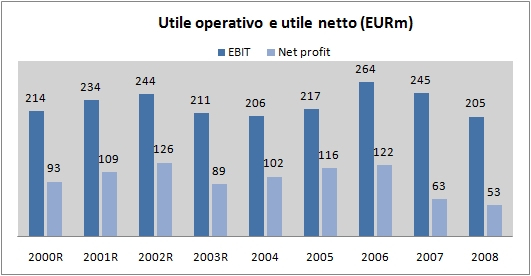 L’effetto combinato di questi due elementi ha determinato un calo dell’utile operativo del 16% a 204 milioni di euro. Se guardiamo al dato piu’ significativo, quelle delle non cooperative, il calo e’ stato del 24%. Sotto l’utile operativo gli interessi sul debito sono cresciuti, sia per gli alti tassi di interesse del periodo che per il debito che continua a salire. L’utile prima delle imposte scende quindi del 35% per il campione totale e del 38% per le aziende non cooperative. L’utile netto cala di meno essenzialmente perche’ nel 2007 erano state contabilizzate delle perdite straordinarie per EUR27 milioni, che quest’anno erano quasi scomparse (EUR2 milioni).
