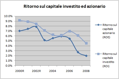 L’ultimo grafico vi rende conto del ritorno sul capitale, in costante diminuzione: nel 2008 il ritorno e’ sceso sotto il 5%, il che sostanzialmente significa “distruzione di valore”: in altre parole, il capitale investito in questo campione di 99 aziende ha un rendimento che e’ inferiore a quello che gli investitori (azionisti e finanziatori) richiederebbero.