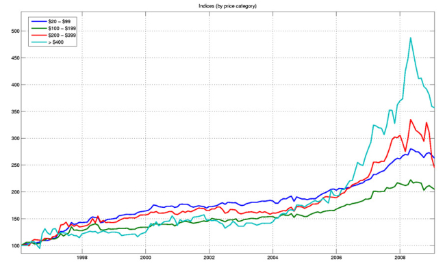 Infine, un punto va fatto sulle fasce di prezzo. In termini di rendimento non c’e’ dubbio che il top nel periodo totale si sia raggiunto con la fascia oltre i 400 dollari e in quella dei “first growth”, che sono saliti del 284% e del 450% rispettivamente. E questi vini sono anche quelli che non si comportano cosi’ tanto peggio degli altri nei periodi di recessione… e quindi in questo caso vale il discorso che chi piu’ spende meglio spende.