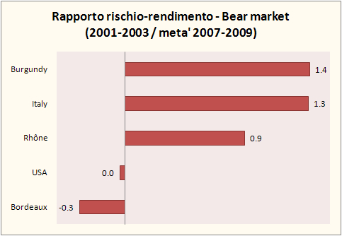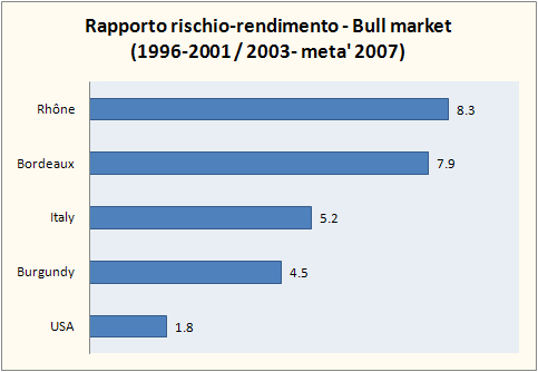 Chi vince e chi perde: (1) in termini di rendimento assoluto e di volatilita’ il vino vince contro la borsa; (2) in termini di rendimento assoluto tra il 1996 e il 2009, il meglio sono stati i vini della Valle del Reno che sono quadruplicati, seguiti da quelli di Bordeaux e di Borgogna (triplicati). Gli italiani si consolano con un +125% (raddoppio). (3) Quando si guardano i dati in relazione al rischio le cose di poco: i vini di Bordeaux guadagnano punti e si avvicinano (senza superarli) a quelli del Rodano, i vini di Borgogna perdono punti e posizione in favore dei vini italiani, che hanno mostrato un andamento piu’ costante nel tempo. (4) quando separiamo i “tempi buoni” (1996-2001 e 2003-2007) dai “tempi cattivi” (2001-2003 e 2007-2009) ritroviamo altre caratteristiche interessanti: i vini del Rodano e di Bordeaux sono praticamente equivalenti in termini di rischio/rendimento, in cima alla classifica nei tempi buoni. Nei tempi cattivi bisogna invece investire nei vini di Borgogna e in quelli italiani che mantengono un rendimento positivo, cosi’ come in misura minore accade per i vini del Rodano. Invece i vini di Bordeaux hanno dei rendimenti negativi. (5) Lo studio include anche i vini americani, che pero’ figurano male da qualunque lato si guardino, quindi non mi dilungherei troppo su questo punto.