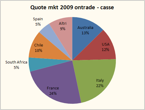 Il canale offtrade ha totalizzato 99 milioni di casse, +3% rispetto al 2008. Se includiamo anche i valori, il mercato e’ cresciuto del 7% circa. In questo contesto, il dominatore del mercato, cioe’ l’Australia, ha subito un calo dell’1% dei volumi e gli USA, lo storico numero 2 hanno perso il 7%. Il peggior andamento e’ pero’ fatto registrare dalla Francia, che perde quasi 2 milioni di casse a 12.3m, lasciando il terzo posto all’Italia che ha incrementato le vendite del 9% a 13.2 milioni. Piu’ sotto, e’ impressionate il forte incremento del Cile e del Sud Africa, che crescono del 26% e 23% rispettivamente. Il Sud Africa, in particolare, con 12 milioni di casse si candida a superare la Francia per volumi nel 2010.