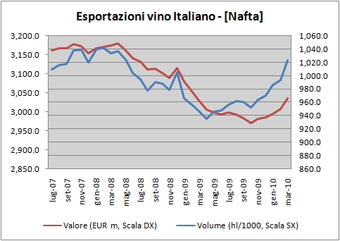 Le esportazioni di vino di Marzo hanno confermato il recupero dei mesi precedenti, con un +11% sul mese, che porta il primo trimestre 2010 a chiudere a +11% e a riportare il dato dei 12 mesi in pari con quelli precedenti. A trainare le esportazioni di questi mesi sono due fattori, in parte concatenati: (1) il forte recupero dell’export nell’area Nafta (USA e Canada); (2) l’andamento eccellente dei vini imbottigliati. Dall’altro lato, i vini sfusi sono stabili con tendenza al ribasso (-4% nel mese e -5% nel trimestre), mentre i vini spumanti sono lo specchio degli sfusi: stabili con tendenza al rialzo (+5% nel mese +9% nel trimestre). Un fattore comune ai vini sfusi e ai vini spumanti e’ che il prezzo-mix continua a peggiorare, segno che esportiamo prodotti di minore qualita’, ma anche che non stiamo per nulla approfittando del miglioramento dello scenario dei cambi: con l’euro debole simao in grado di vendere un prodotto allo stesso prezzo in valuta locale e guadagnare di piu’ in Euro. Una ultima considerazione: questi dati si confrontano con quelli del 2009 che di questi tempi era il mese della fine del mondo…