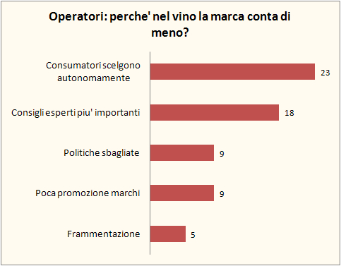 (4) Ma perche’ la marca conta di meno? Il 47% di coloro che dicono che la marca non conta si giustificano in questa maniera: il 23% parla di una autonomia di scelta dei consumatori che va al di la della marca (ma qui mi pare che si sconfini nel campo degli appassionati? Quanti sono i consumatori appassionati rispetto a quelli normali?). Altri parlano della presenza degli opinion leader: cioe’ sono piu’ importanti gli esperti delle marche. Altri pero’ mettono in campo questioni piu’ sensibili, come politiche di marketing errate oppure mancati investimenti, oppure, e qui si sfondano porte che su questo blog sono aperte, la frammentazione del settore del vino in Italia.