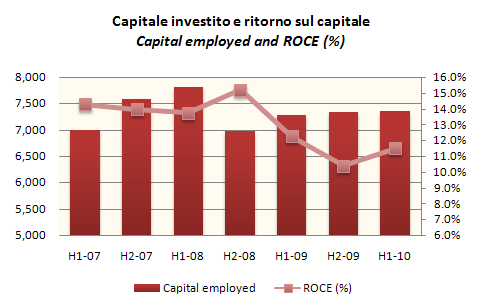 Il recupero di questo primo semestre, unito a una stabilita’ del capitale investito, ha consentito al gruppo di mantenere un ritorno sul capitale sopra il 10%, e per la precisione circa l’11.5% se calcolato sul capitale investito medio. E’ un risultato molto positivo, se considerato la tendenza negativa del mercato (il risultato terribile del secondo semestre potra’ essere migliorato quest’anno) e il fatto che l’azienda ha raggiunto il massimo storico in termini di valore dei prodotti in fase di affinamento a EUR3.2 miliardi, che corrispondono a circa il 108% delle vendite annuali (a giugno 2010) del gruppo.