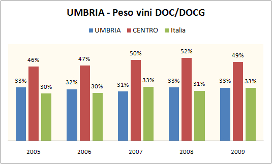 – Il valore della produzione vinicola e’ in forte incremento, secondo ISTAT. Anche nel 2009, quando in Italia e’ calato del 6%, in Umbria e’ cresciuto del 7%, anche se partendo da un livello molto piu’ basso. Rispetto agli ultimi 5 anni la produzione di vino e’ a valore l’1% sopra, mentre in Italia e’ a 0.