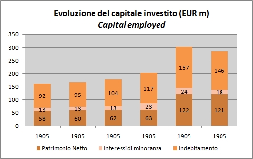 Dal punto di vista patrimoniale, la riorganizzazione ha portato a un incremento del debito, che si vede tra il 2007 e il 2008, da circa 120 milioni a quasi 160 milioni, che sono poi rientrati a poco meno di 150 miliioni nel 2009. GIV specifica che la posizione finanziaria netta a fine 2009 era di EUR125 milioni contro EUR145 milioni di fine 2008, cui si contrappone un patrimonio netto di 140 milioni, con un rapporto debito patrimonio di 0.90. L’incremento di debito del 2007-08 e’ stato controbilanciato da un forte incremento delle immobilizzazioni, a fronte delle operazioni di acqusizione di cui abbiamo parlato. Le immobilizzazioni materiali sono passate da 118 miliioni del 2007 agli oltre 185 miloni del 2009. Il capitale investito e’ quindi passato da 203 milioni nel 2007 ai 303 milioni del 2008 e ai 286 milioni del 2009.