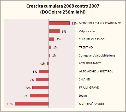 • Tra il 2005 e il 2008 la crescita piu’ rilevante e’ dell’Asti spumante, seguito dal Conegliano Valdobbiadene e dalla DOC Trentino. Mi pare che gli spumanti siano chiaramente al comando in questa classifica.