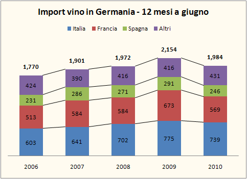 Analizziamo oggi I dati sull’import di vino in Germania nei primi 6 mesi del 2010, come forniti da OEMV secondo le serie export. Vi dico subito che c’e’ qualche incongruenza con i dati pubblicati in Italia da ISTAT, anche se non si tratta di questioni particolarmente critiche. La Germania e’ un grande mercato come sapete: nei 12 mesi terminati a giugno 2010 ha importato vino per 2 miliardi di euro, corrispondenti a 14m di ettolitri. Come potete apprezzare dai dati, i tedeschi bevono la stessa quantita’ di vino estero dei 12 mesi a giugno del 2009 o del 2008, ma spendono di meno, circa l’8% in meno del 2009. Diciamo che sono tornati a spendere quello che spendevano nel 2008, annullando i guadagni del 2009.