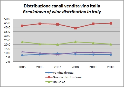 Il rapporto Mediobanca 2011 ha rinnovato l’indagine sui canali di vendita. I risultati non sono molto differenti dallo scorso anno, ma vale la pena di aggiornarli perche’ confermano alcune importanti tendenze, e in particolare: (1) il sempre crescente ruolo della grande distribuzione nella vendita di vino, ma non nella vendita dei grandi vini (oltre 25 euro); (2) la crisi del settore della ristorazione, che e’ continuata nel 2010 nonostante la stabilizzazione dello scenario economico; (3) il ruolo predominante di ristorazione ed enoteche nella distribuzione dei grandi vini, che chiaramente apre la strada a considerazioni di specializzazione che ogni enotecario dovrebbe fare. Lo studio poi guarda come al solito alla distribuzione all’estero e spacca i dati tra cooperative e aziende vinicole. Novita’? Beh, i vini italiani continuano a essere distributi all’estero in maniera predominante attraverso reti di terzi (81% del totale dei vini, addirittura 87% per i grandi vini), il che dimostra la dimensione poco signifativa delle nostre aziende che non possono permettersi reti proprie. In questo contesto, le cooperative avendo una dimensione piu’ significativa sono meglio posizionate. Allo stesso modo, data la dimensione signifcativa le cooperative restano delle controparti ideali per le grandi catene distributive: di conseguenza una quota maggiore dei loro prodotti viene veicolata attraverso la GDO.