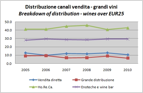 Terminiamo con la distribuzione estera. All’estero il vino italiano e’ distribuito direttamente soltanto per l’8% del totale. E’ molto poco. Volendo girare il numero si potrebbe dire che nel 92% dei casi il settore vinicolo italiano non ha la forza di distribuire il prodotto direttamente ma deve affidarsi a terzi. La tendenza e’ oltretutto in calo, dato che questo valore era ben superiore al 10% in tutte le indagini degli scorsi anni salvo una. Nel caso dei grandi vini la vendita tramite reti diretti e’ addirittura scesa al 6%, valore bassissimo. Si dovrebbe aprire una discussione per cercare di far crescere la massa critica delle aziende italiane all’estero: fusioni tra grandi operatori? Joint ventures nella distribuzione?