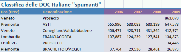 Quali sono le novita’? Beh, la prima novita’ e’ che nella top 10 appare una nuova DOC che e’ il Prosecco, della regione Veneto. E’ la seconda DOC Italiana dopo il Montepulciano d’Abruzzo e, come vedete dalla classifica degli spumanti, e’ diventata il leader italiano tra gli spumanti sopravanzando l’Asti: 863mila ettolitri contro 647mila. Se poi aggiungessimo i 34mila ettolitri della DOC Prosecco del Friuli (non sono certo si tratti della stessa cosa dal punto di vista legale, ma dal punto di vista sostanziale non c’e’ dubbio), gli 863mila ettolitri diventano 897mila ettolitri: il Prosecco diventa automaticamente la prima DOC Italiana, praticamente a pari merito con i 895mila ettolitri del Montepulciano d’Abruzzo. E di piu’ ancora se decidessimo di aggiungere il Conegliano Valdobbiadene, (413mila ettolitri) arriveremmo a 1.3m di ettolitri, cioe’ la prima DOC italiana.
