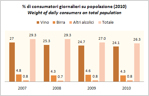 I consumatori di vino in Italia sono secondo ISTAT il 53.3% della popolazione, rispetto a 54% del 2009 e il 57.6% del 2005. Il vino resta la bevanda alcolica con piu’ consumatori: la birra sta al 45.9% (piuttosto stabile negli ultimi anni), mentre gli altri alcolici sono al 40% circa (anch’essi stabili). Nella suddivione per sesso, sono consumatori di vino il 67% degli uomini e il 41% delle donne, i primi in calo le seconde stabili.