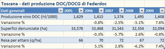 • Secondo Federdoc sono stati prodotti 1.6m/hl di vini DOC/DOCG in Toscana nel 2009, con un incremento di 0.1m/hl rispetto al 2008 e in linea con la media storica. Il dato ufficiale ISTAT era di 1.7m/hl.