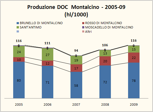 • La zona di Montalcino ha avuto una produzione DOC di 116mila ettolitri, di cui 78mila di Brunello e 22mila di Rosso di Montalcino. La produzione di Rosso di Montalcino e’ al massimo dal 2005 a questa parte, quella di Brunello in forte recupero dopo la crisi e lo scandalo dell’annata 2007. Resta molto bassa la produzione di Sant’Antimo DOC.