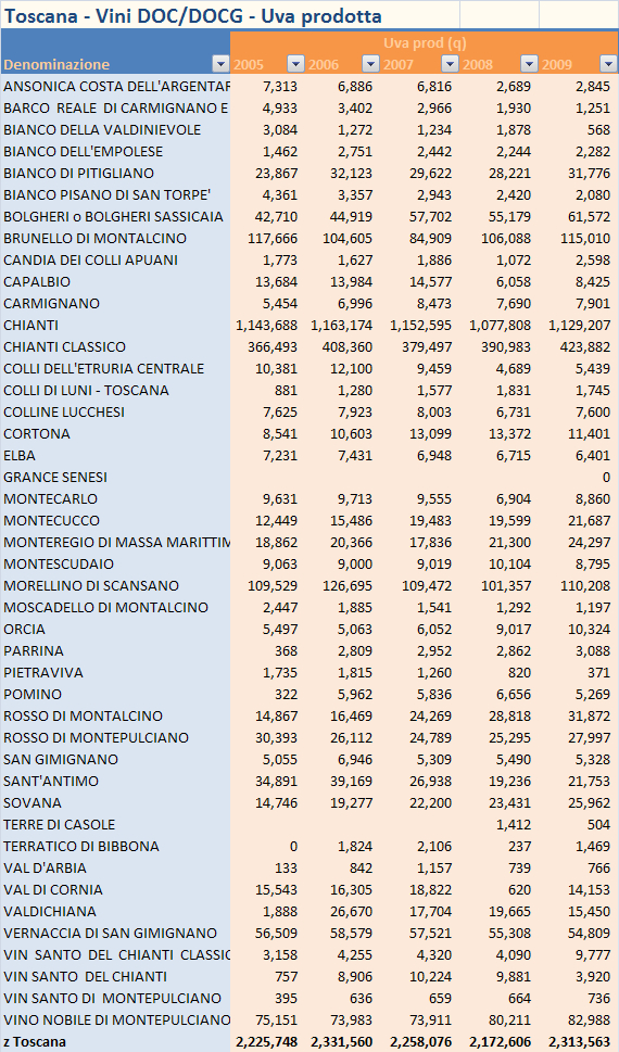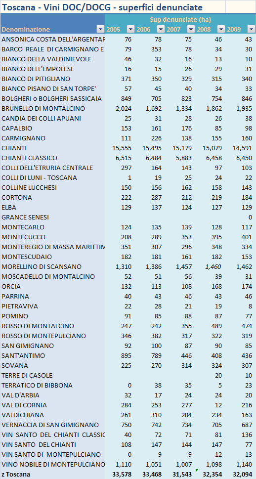 beh, su I numeri del Vino se cerchi Toscana e Federdoc, trovi dati di produzione, superfici denunciate e via dicendo per il Chianti Classico. Purtroppo fino al 2009…