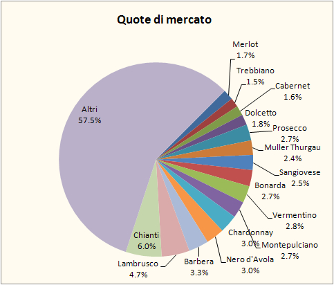 Nel guardare i dati non fatevi ingannare: e’ un mischione di DOC e vitigni che un sommelier senz’altro boccerebbe. Pero’ credo sia la definizione dei commercianti e tanto ci basta: lo chiameremo “prodotto”. Il prodotto leader resta il Chianti che nel 2010 e’ cresciuto del 10% a valore e del 17% a volume, superando quota 50 milioni di euro. Ha una quota del 6%. Il secondo prodotto e’ il Lambrusco con 43 milioni di vendite, in crescita del 3% (volumi +6%), mentre il terzo prodotto resta il Barbera con +1% a 31 milioni di euro (volumi -2%).