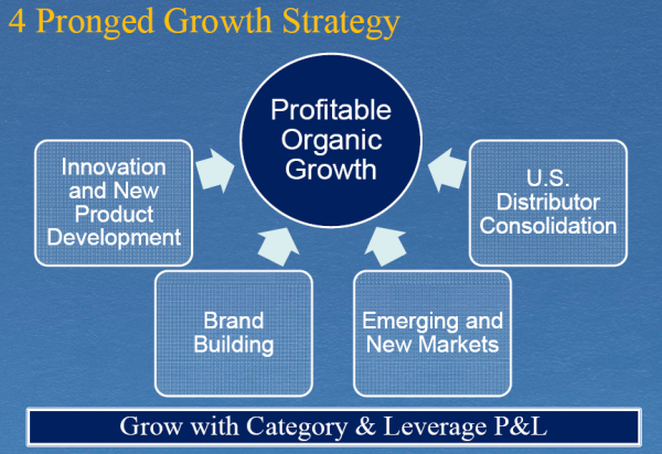 Lo scorso maggio l’azienda ha presentato le sfide dei prossimi 2 anni: l’opportunita’ e’ sempre la medesima. Il mercato del vino USA e Canada. Mercati dove la penetrazione pro-capite resta bassa e il prezzo medio per bottiglia e’ molto piu’ elevato che negli altri grandi mercati. Inoltre, il CEO Bob Sands non ha dimenticato di citare la famosa statistica secondo cui gli USA hanno superato la Francia nel consumo totale di vino per volume. L’obiettivo e’ di continuare a crescere in modo “profittevole”, con un occhio anche ai mercati emergenti. Per la prima volta ci sono un paio di slide interessanti sui mercati BRIC dove CB comincera’ a concentare la propria attenzione. Si parla soprattutto di Cina. Quali sono dunque i 4 imperativi strategici: (1) innovare i prodotti; (2) migliorare i marchi; (3) entrare nei mercati emergenti; (4) sfruttare il consolidamento dei distributori in USA. Tutto il materiale sul sito di Constellation Brands, in questa pagina.