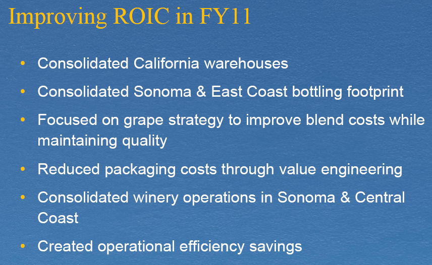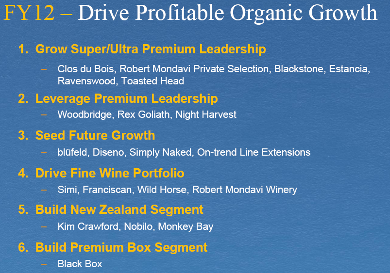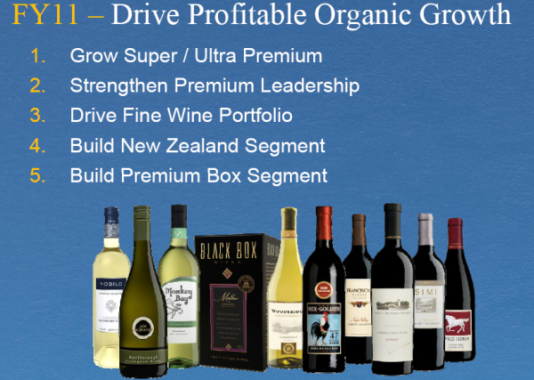 Ogni 2 anni Constellation Brands (CB) aggiorna gli investitori sulla sua strategia. Avevamo commentato nel 2009 un piano biennale basato sul “mettere ordine in casa”. Vendere i rami secchi: Australia e Regno Unito dal punto di vista geografico, e alcuni marchi non strategici. Rifocalizzare l’azienda sulla generazione di cassa e sulla riduzione del debito. Cambiare il modello organizzativo da una organizzazione decentrata a una centralizzata. Rivedere la strategia distributiva. Il tutto era contenuto in questo post di 2 anni fa. Bisogna dire: detto, fatto.