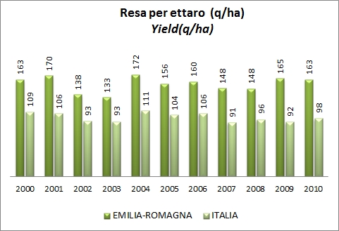 • Le rese per ettaro si mantengono di conseguenza elevate a 163q/ha nel 2010 (-1% rispetto al 2009).