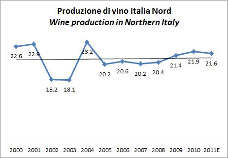 • Produzione totale Nord Italia 21.6m/hl, il 4% sopra la media del decennio 2000-10, Centro Italia a 5.8m/hl (-17% rispetto a media decennale), Sud a 16.5m/hl (-18%).